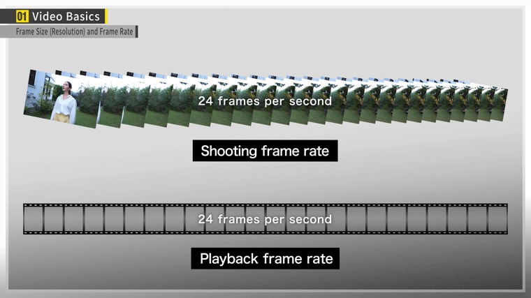 A video consists of a series of still images. The frame rate refers to the number of images displayed in a span of one second. The higher the frame rate, the smoother the video. You can select a suitable frame rate according to the atmosphere you want to produce and the purpose of the video. A frame rate of 30p (30 fps) is often used for television and YouTube. 24p (24 fps) is often used for cinema, whereas 60p (60 fps) is used for videos that feature fast motion and computer graphics.