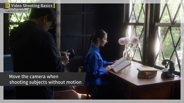 There are many ways to do this. For example, you can slowly move the camera from the subject's hand level up to the head or intentionally start with the subject out of focus and then gradually focus on the subject. When adding movement with the camera, you will also need to leave room. Keep the shot still for at least 5 seconds each at the start and end of the cut before moving.