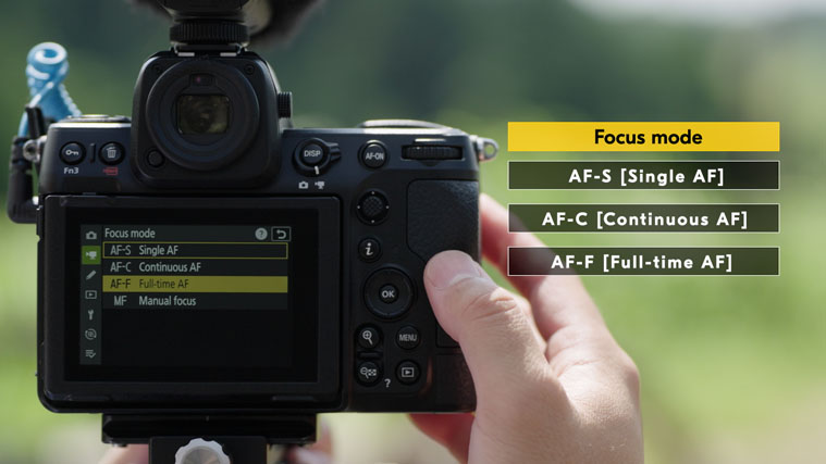 First, let's look at focus mode settings. When shooting video, you can select the focus mode from AF-S, AF-C, or AF-F.