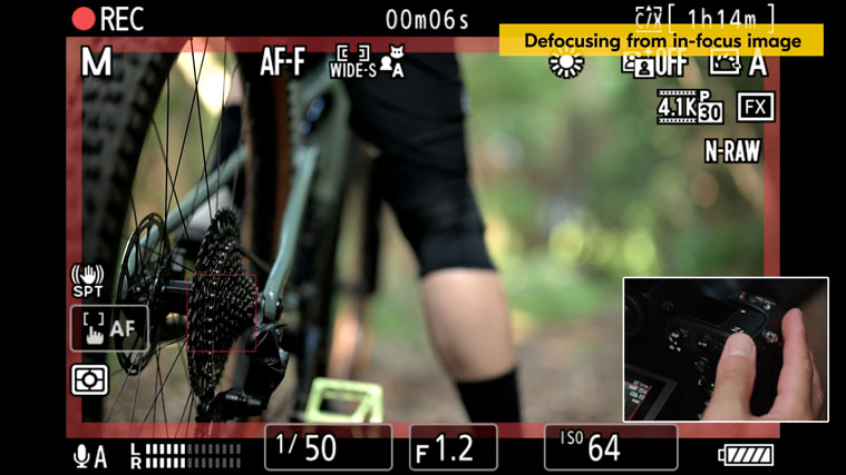 To pull the focus to a subject, press the assigned button for AF lock only when the frame is out of focus. Then, take your finger off the button when you want to rack focus. The frame will gradually shift to being in focus.