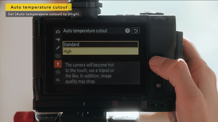 Select [High] for [Auto temperature cutout] in the setup menu to reduce the probability of the camera turning off automatically while being used for extended periods or in direct sunlight.