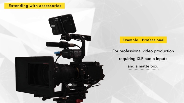 Using a dedicated XLR adapter provides XLR audio input. We recommend using a height-adjustable baseplate when attaching a matte box on rods.