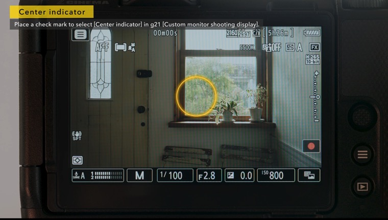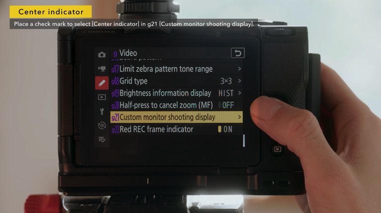 To display a crosshairs at the center of the frame, select it with custom setting g21 [Custom monitor shooting display].